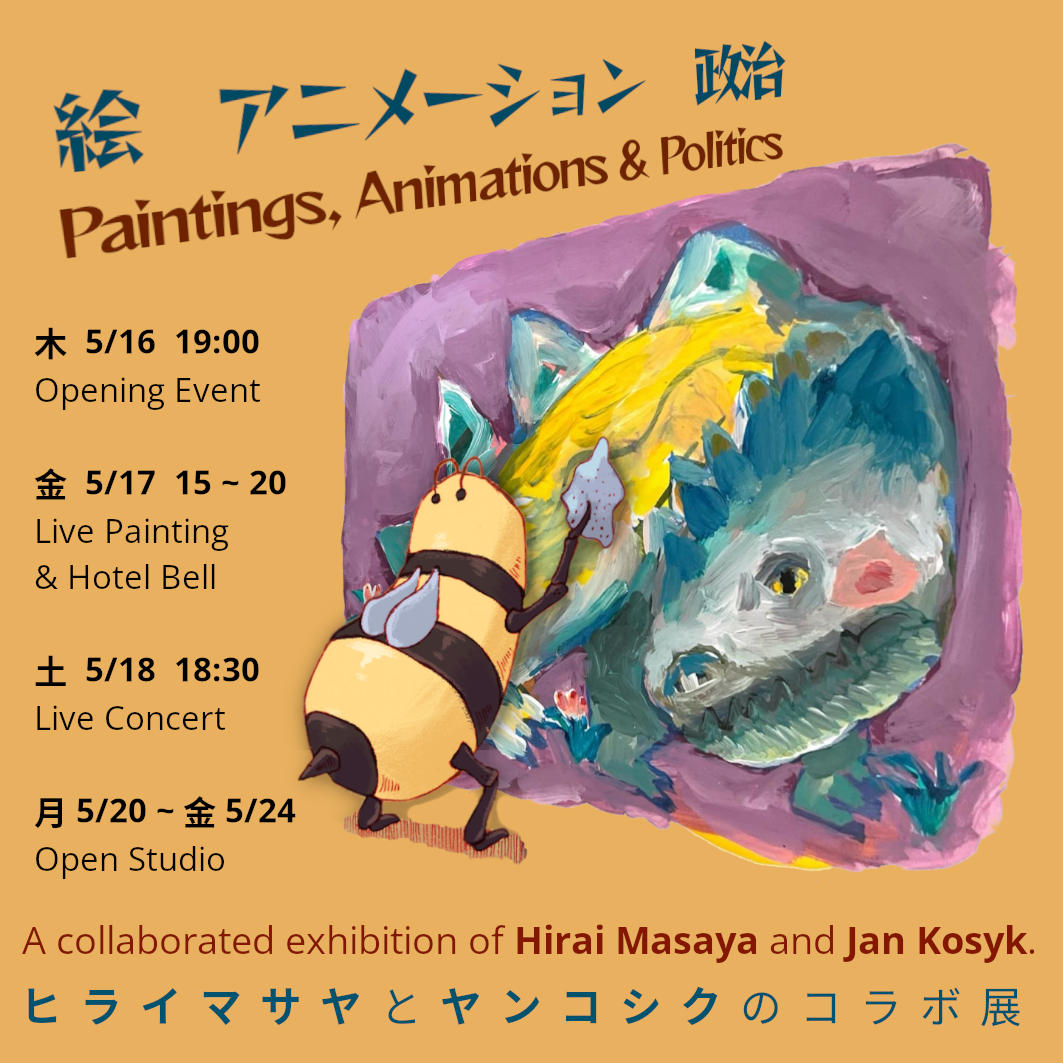 別府在住のヒライマサヤとドイツ出身のヤン・コセクは昨年出会い、一緒に音楽を作りはじめました。1 年後の今、ふたりはマサヤによるかわいい絵画とヤンによる政治アニメーション映画を展示する初のコラボ展を開催します。